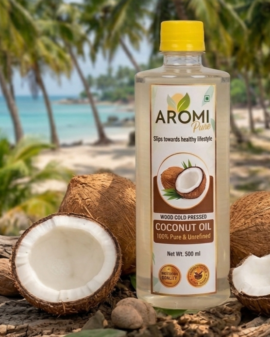 Original price was: ₹975.00.₹775.00Current price is: ₹775.00.Coconut Oil (500ml) – Wood Cold Pressed – Aromi Pure