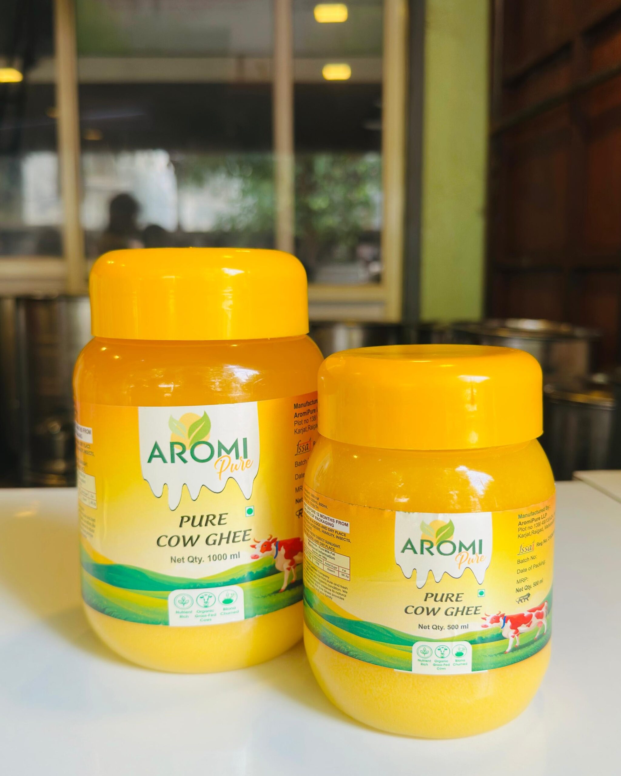 Aromipure Pure Desi Cow Ghee is crafted using the traditional Bilona method — curd is hand-churned to separate butter, which is then slow-cooked over a gentle flame until it transforms into clarified ghee with a naturally golden hue, rich nutty aroma, and crystalline texture.