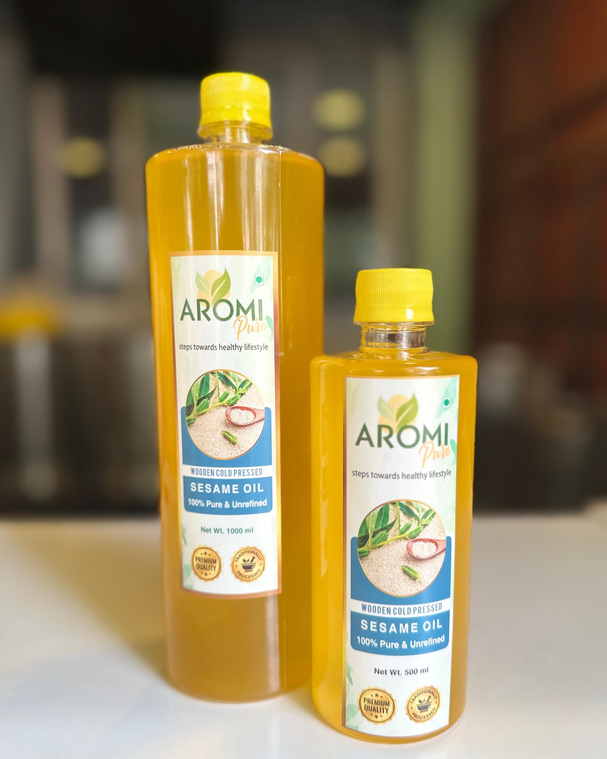Original price was: ₹750.00.₹600.00Current price is: ₹600.00.Sesame Oil (500ml) – Wood Cold Pressed – Aromi Pure