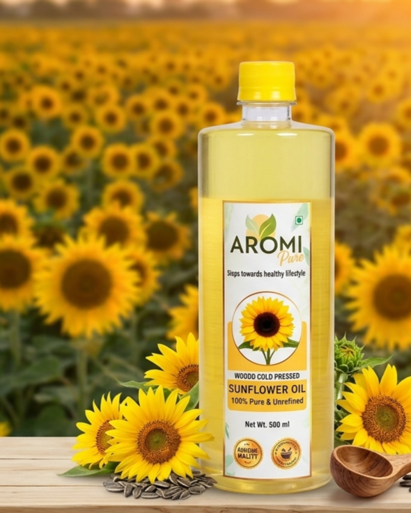 Original price was: ₹550.00.₹425.00Current price is: ₹425.00.Sunflower Oil (500ml) – Wood Cold Pressed – Aromi Pure